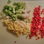 Knoblauch, Ingwer, Frühlingszwiebeln und Peperoni klein schneiden.