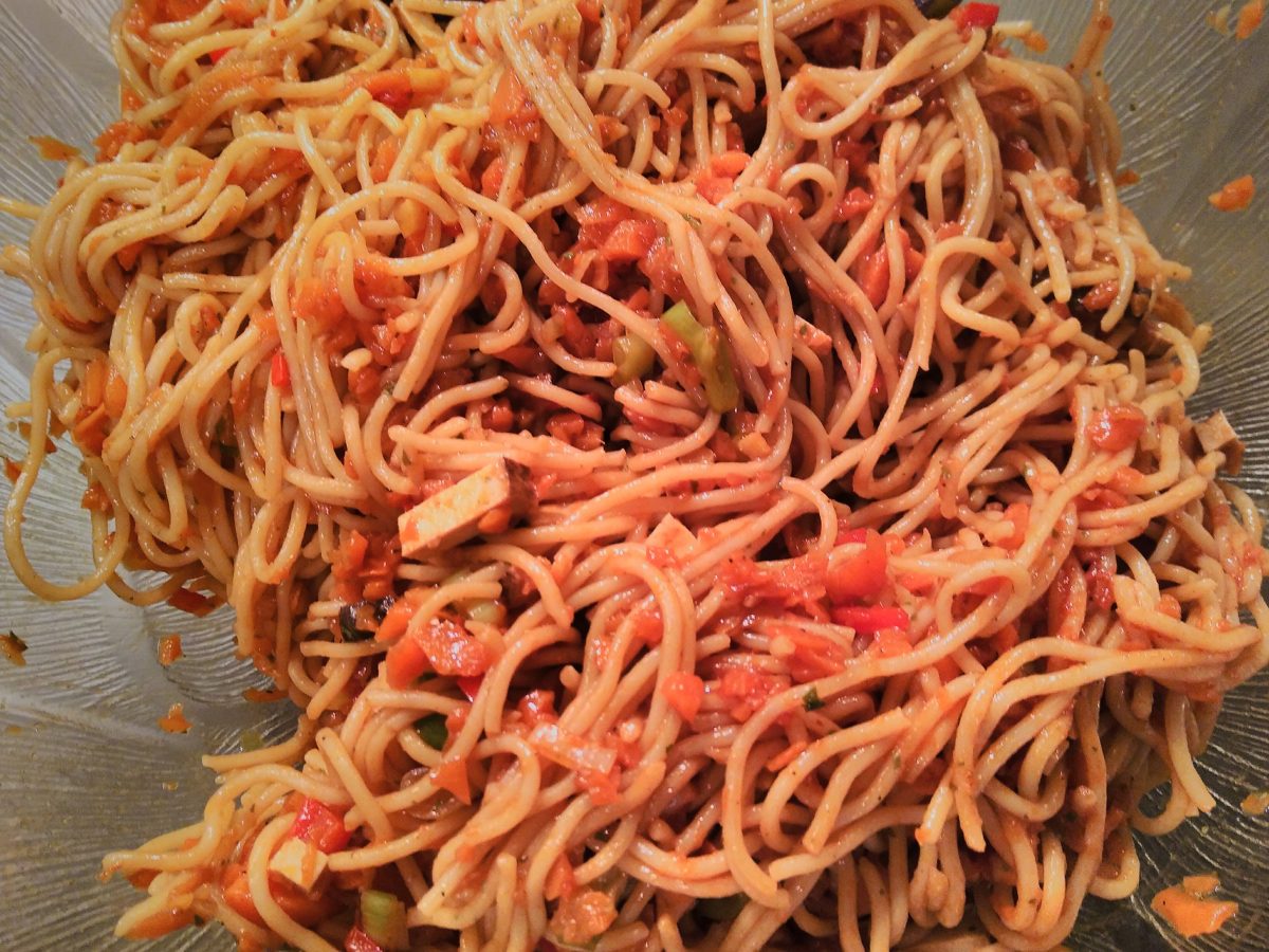 leckerer, scharfer, veganer Spaghettisalat, der auch Fleischessern schmeckt 😉